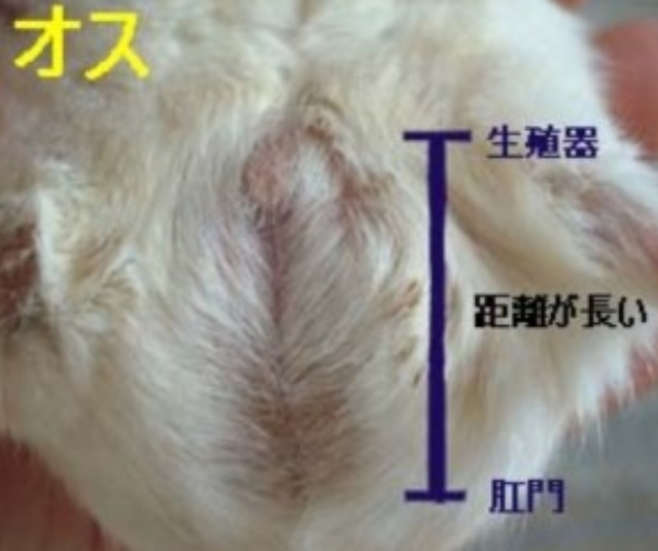オスの場合は尿道口(生殖器)と肛門の間隔が長いのが特徴。